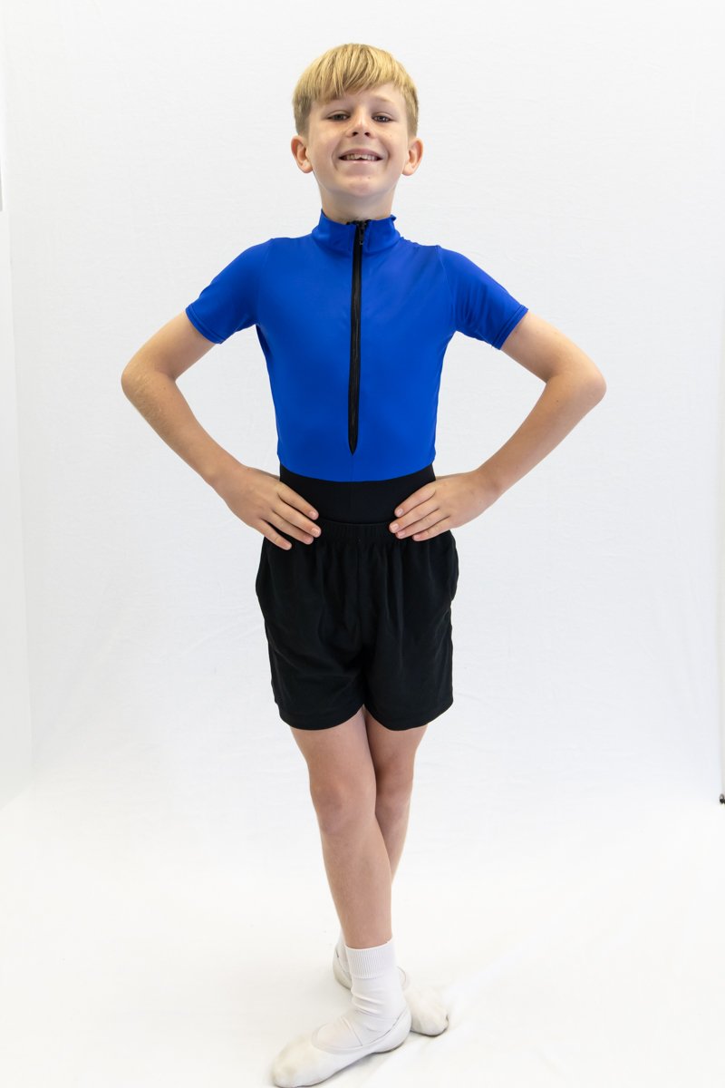 CSBS leotard with royal blue velvet; black dance shorts; optional footless tan tights. Grades Gold+ wear black footless tights instead of shorts.