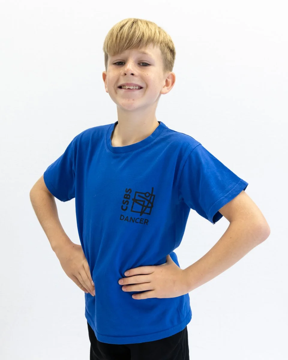 MALE: Royal blue CSBS t-shirt; black dance trousers or shorts; black dance socks; black tap shoes